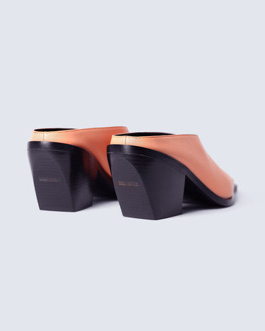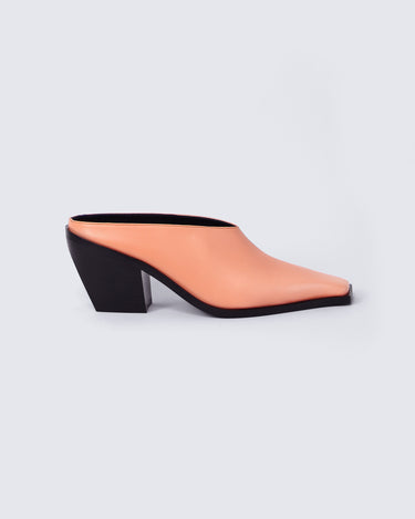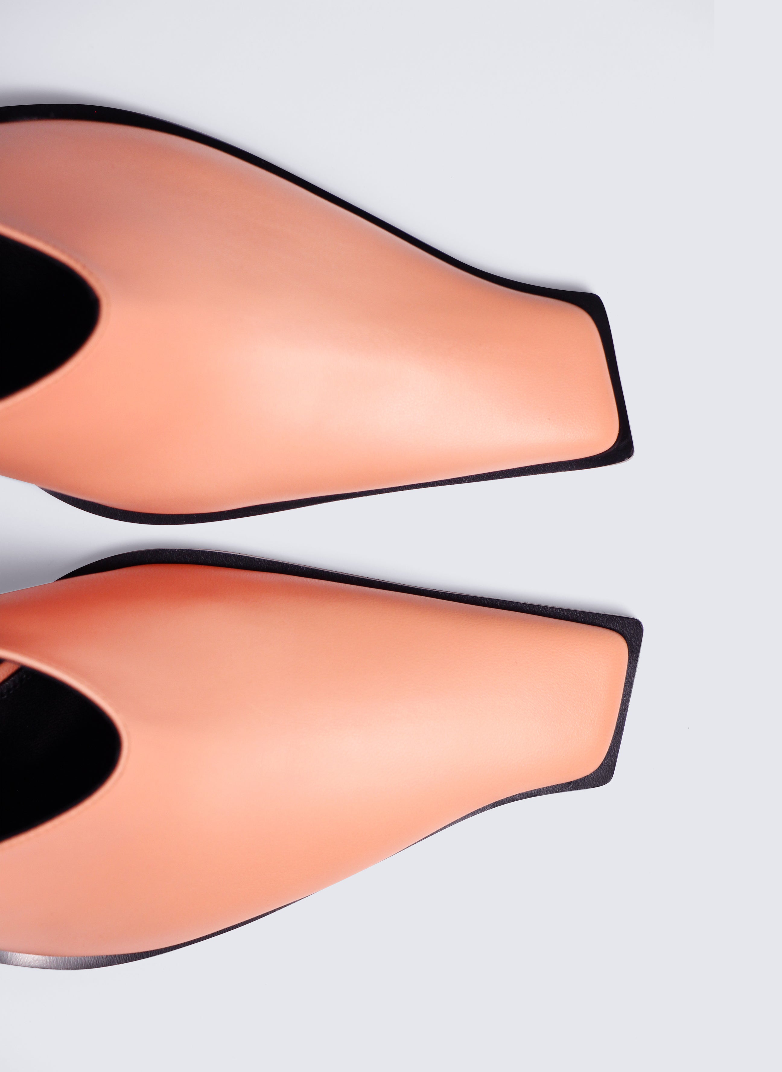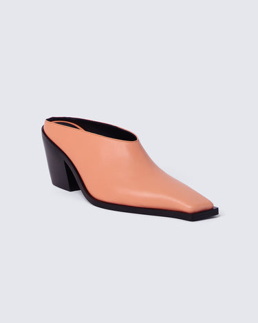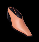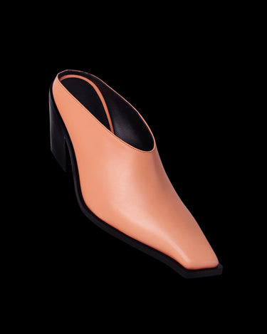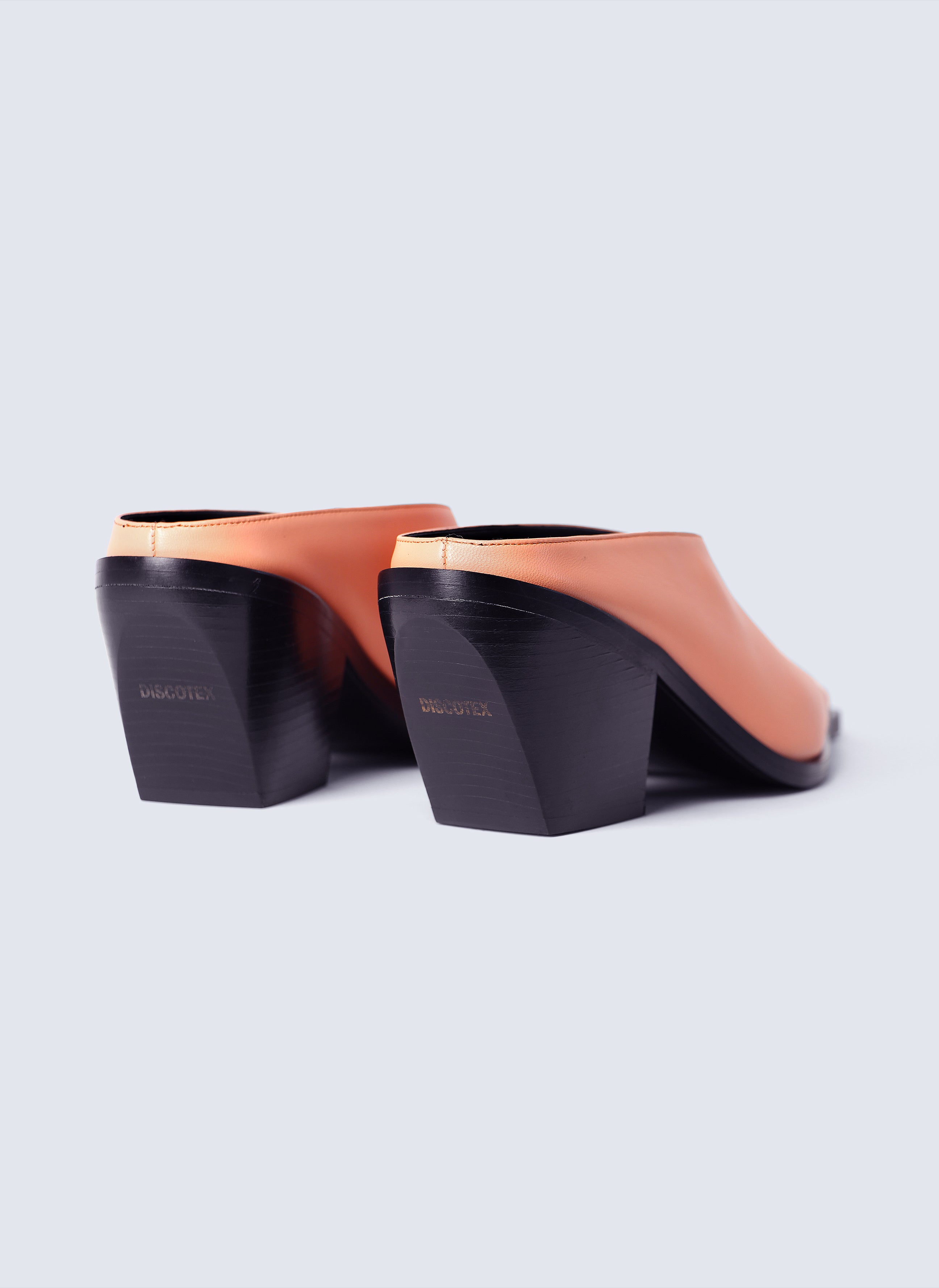 SCULPTED LEATHER SABOT WITH SIGNATURE SQUARE TOE. Sabotage is crafted from premium deadstock leather, this sculptural sabot features a signature square toe, unique to Discotex. The 75 mm solid wood heel is wrapped in smooth leather and engraved with the Discotex logo a discreet detail with strong intent. Fully lined in leather and finished with a memory foam insole, it offers unexpected comfort without compromising on attitude.