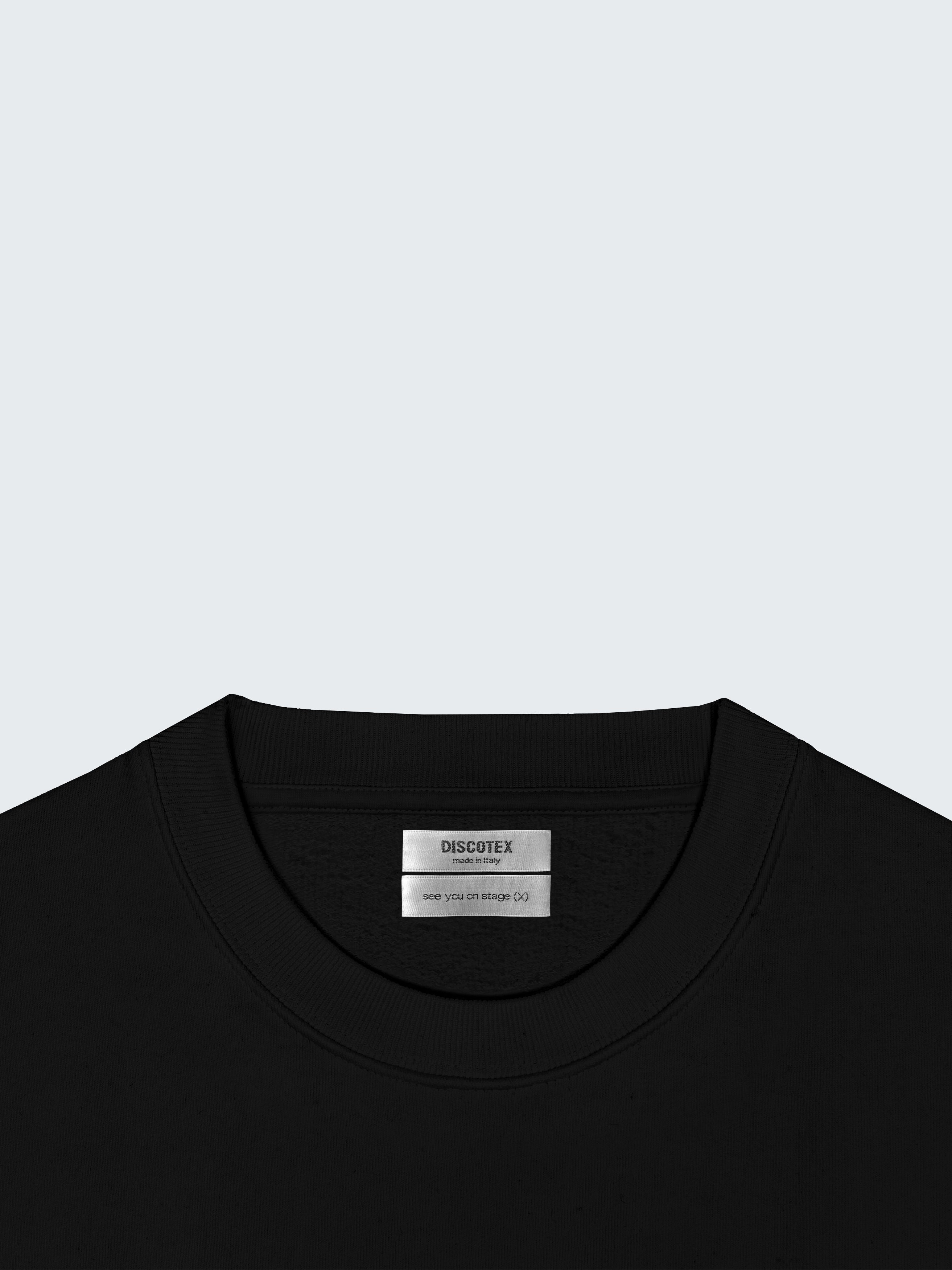 Our Militanza Melodica Crewneck in black is crafted from 100% organic cotton and made in Portugal. With its unisex one size regular fit – wearing like a men’s XL – this oversized sweatshirt delivers cozy comfort with a bold graphic edge. Infused with Discotex’s nightlife energy, the Club Kisses Crewneck embodies the raw power of the dancefloor, where kisses, beats, and freedom collide.